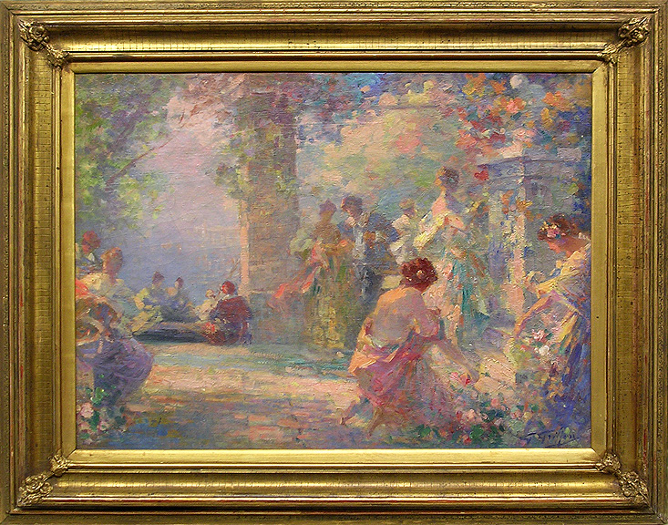 | Original oil on canvas. Hand signed by the artist in blue paint lower right. Dimensions: 21 1/4" x 28 3/4"; Framed: 28 3/4" x 36 3/8" Griffon was born in Toulouse, a town in Southwest France. He is best known for allegorical and genre paintings; his garden scenes and his ‘fêtes galantes’ remind one of the 18th century works of Watteau, but interpreted in a post impressionist, fluid and ethereal manner. His palette is clear and fresh and his brushwork is subtle yet assured. Today, his work is in collections in Paris, London, New York, Boston and Geneva. |