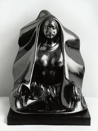 | Original black marble sculpture on a two inch black wood base. Signed by the artist in the marble lower left verso: "Amaya 1994." Dimentions: (H)16 3/4" x (W) 14" x (D) 20 1/2" Tehuantepec, a town located in the state of Oaxaca, Mexico, is situated near the Gulf of Tehuantepec, an arm of the Pacific. Its inhabitants are predominantly Zapotec, as the population of Oaxaca is dominated by the Mixtec and Zapotec peoples. Tehuantepec is celebrated for its strikingly dressed women, called Tehuanas. A distinctive feature of the Tehuana costume, the "tocado", or head-piece, made of pleated fabric trimmed with lace, points to the influence of Spanish culture on the traditional style of dress. |