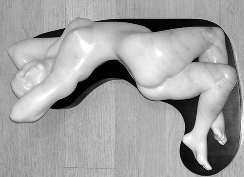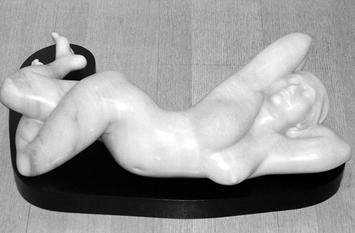 White marble sculpture on a 1 3/4 inch black wood base. Signature and date incised in the stone "Amaya 2004".