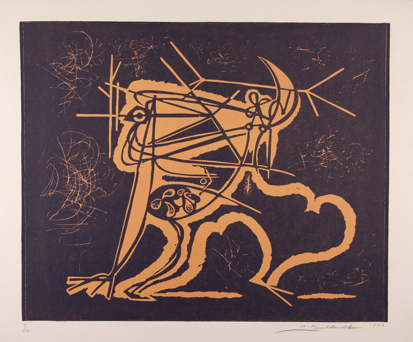 Original linocut on Arches wove paper. Hand signed and dated by the artist in pencil, "H. Burkardt, 1976," lower right. Numbered "4/12" in pencil, lower left. In excellent condition.