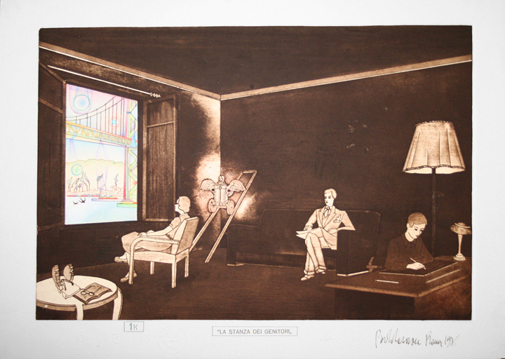 Original etching and aquatint with hand coloring on Fabriano wove paper, with four of the artist’s blindstamps in the lower margin: “Paolo Carosone, Roma, 1976”. A unique impression from a varied edition. In very good condition, unframed.