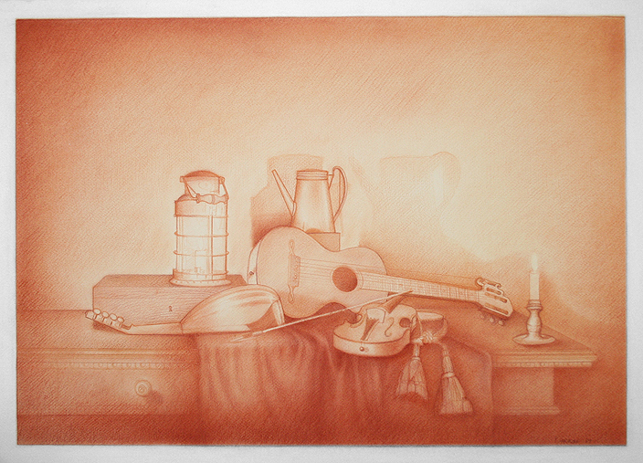 Original drawing in burnt-red conté crayon on 100% Fabriano wove paper with deckled edges. Hand signed and dated in red conté crayon lower right: "P. Carosone 89". In very good condition, unframed.