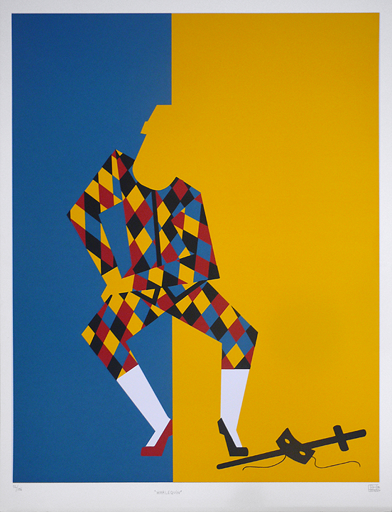 Original silk screen on paper. Signed and dated by the artist in lower right, titled "Harlequin" in lower middle and numbered "56/196" il lower left. In very good condition. Paper size: 33 3/4" x 25 3/4"; Image size: 30 5/8" x 23 7/8"