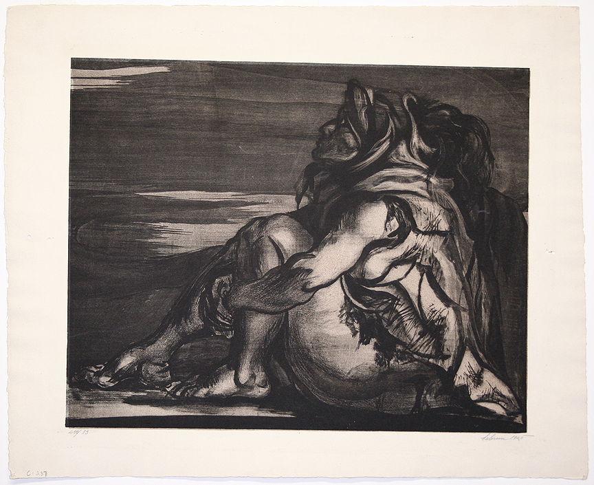 Original lithograph on wove paper. Hand signed, dated and numbered by the artist in pencil, “Lebrun 1945” lower right, “450/33” lower left. In excellent condition. Lebrun immigrated to the United States in 1924 to design stained glass in Springfield, Illinois. The next year the artist settled in New York, where he built a successful commercial art practice as a fashion illustrator and advertising artist. By 1930, Lebrun was prosperous, but dissatisfied. He abandoned his business and entered the field of fine arts. After a move to Southern California in 1938, Lebrun taught at the Chouinard Art Institute and then at the Disney Studios, working with animators on the figure of Bambi for the forthcoming feature film. In 1935 he received a Guggenheim Fellowship for his first mural project; in 1942, he exhibited in "Americans 1942" at the Museum of Modern Art in New York. His work appeared in group exhibitions at New York's Whitney Museum of American Art and the Metropolitan Museum. In 1952, the artist left Southern California for Mexico, where he taught at the Institute of San Miguel de Allende. After briefly experimenting with formal abstraction there, Lebrun returned to Los Angeles in 1954 and resumed his prior interest in the human figure, beginning a series of drawings and paintings to memorialize the victims of the Holocaust. In 1958, Lebrun taught at Yale and the next year served as an artist in residence in Rome. When he returned to Southern California in 1960, he began working on the Genesis mural at Pomona College. Lebrun then worked on a smaller scale after the mural's dedication in 1961, making drawings and prints for Dante's Inferno. Becoming ill with cancer in 1963, Rico Lebrun died on May 9th the following year at his home in Malibu.