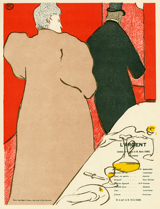 This work is a reduced impression of the coloured programme for Émile Fabre's comedy "L'Argent".   The two figures depicted are that of Henriot and Arquillière who played Monsieur and Madame Reynard.   The absence of modelling in the figures and the positioning of the place-settings brings to mind Toulouse-Lautrec's famous "Reine de Joie" poster.