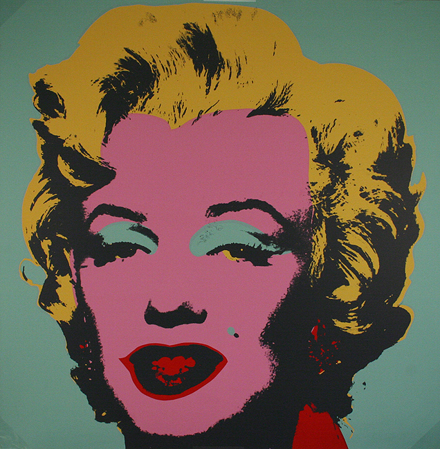 Color screenprint on museum board with the highest quality archival inks, (from a set of 10) after the original Marilyn Monroe screenprints by Andy Warhol. Stamped in blue ink, "Published by Sunday B. Morning" and "fill in your own signature," verso. Published by Sunday B. Morning. In good condition, apart from a small tear in the margin and a punched hole in the center, reflected in the price. |